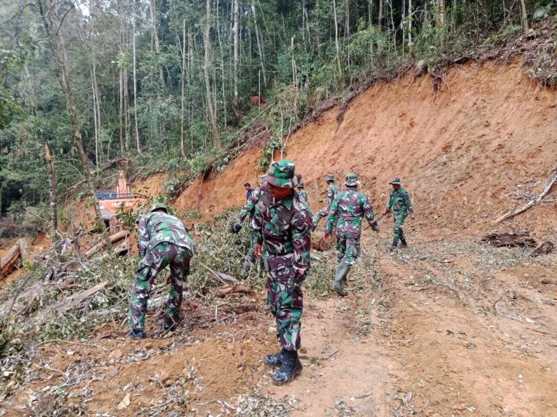 Satgas TMMD ke-126 Kodim 0106/Aceh Tengah bersama masyarakat melaksanakan kegiatan gotong royong membersihkan pepohonan di sepanjang jalur sasaran TMMD, tepatnya di titik nol yang menjadi lokasi utama pembukaan badan jalan.