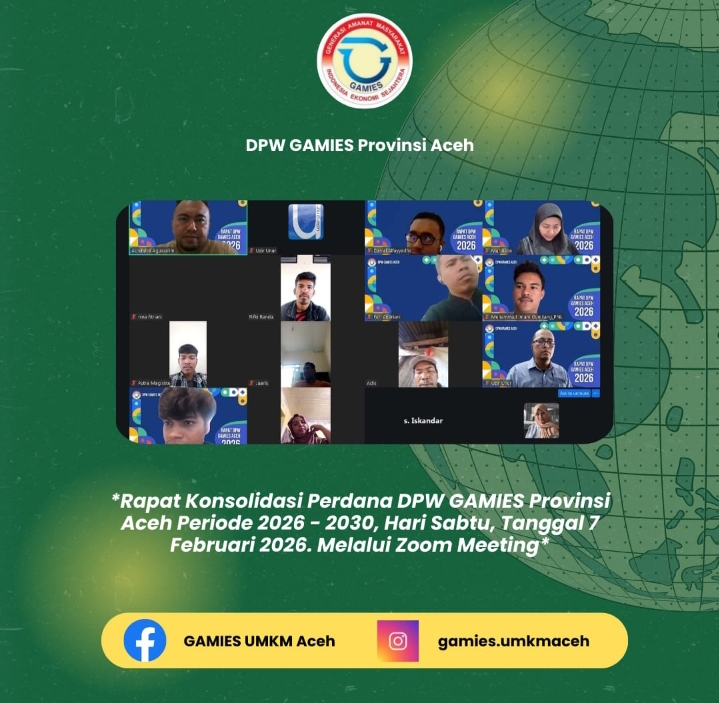 Dewan Pimpinan Wilayah (DPW) Generasi Amanat Masyarakat Indonesia Ekonomi Sejahtera (GAMIES) Provinsi Aceh sukses menyelenggarakan Rapat Konsolidasi Perdana Periode 2026–2030 pada Sabtu, 7 Februari 2026. Kegiatan ini menjadi momentum awal dalam memperkuat soliditas organisasi serta menyatukan visi dan arah gerak kepengurusan lima tahun ke depan.