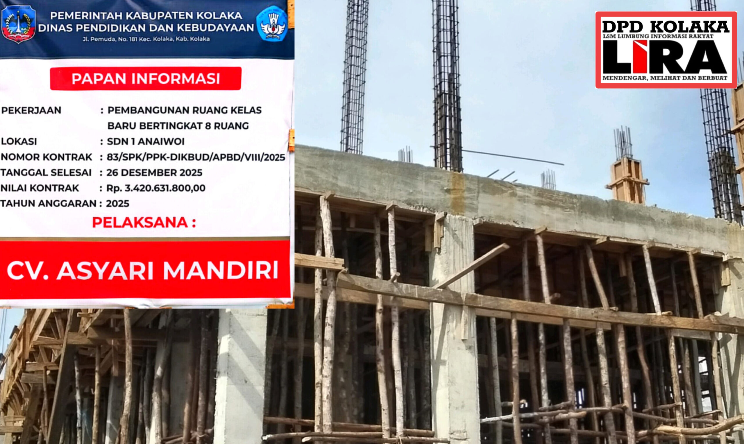 bidik.co.id, Kolaka — DPD LSM LIRA Kolaka kembali menyampaikan sikap resmi terkait perkembangan proyek Pembangunan Ruang Kelas Baru Bertingkat 8 Ruang di SDN 1 Anaiwoi, Kabupaten Kolaka. Proyek yang dikerjakan melalui kontrak Nomor 83/SPK/PPK-DIKBUD/APBD/VIII/2025 dengan nilai Rp 3,420,631,800 dan target penyelesaian 26 Desember 2025, sejak awal memang telah menjadi perhatian serius LIRA Kolaka.